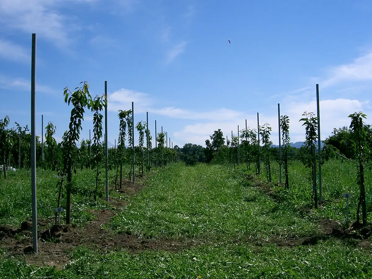 Bereits bei Neupflanzung können Stahlpfosten gesetzt und als Gerüst mit Drahtführungen für die Baum-Erziehung genutzt werden. Die Dachfolie wird erst gespannt, wenn die Bäume im Ertrag stehen – typischerweise nach 2–3 Jahren. So investieren Sie genau dann, wenn sich der Ertrag abzeichnet, und schonen in den ersten Jahren das Budget.