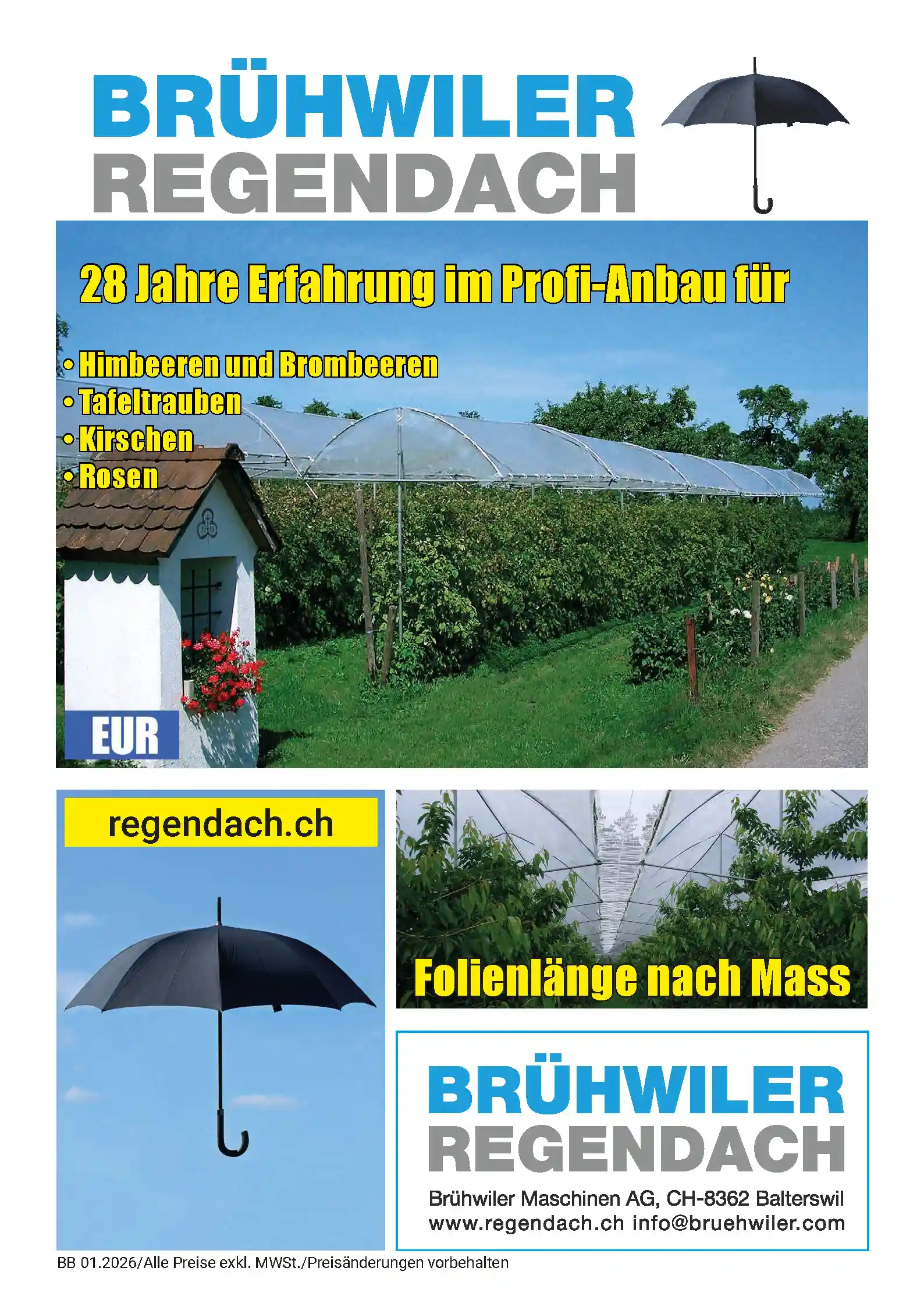 Laden Sie hier unsere aktuellen Prospekte herunter, um einen umfassenden Überblick über das Brühwiler Regendach-System zu erhalten. In den Katalogen finden Sie detaillierte technische Daten und Abbildungen zu allen Modellen (MAXI, CHERRY, CHERRY HOLZ) sowie eine Preisliste. Wählen Sie je nach Währung/Region den passenden Prospekt: für die Schweiz in CHF oder für den Export in EUR. Die Prospekte stehen im PDF-Format zur Verfügung und lassen sich bequem speichern oder ausdrucken.